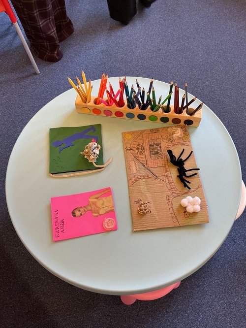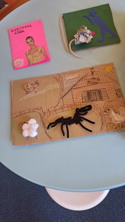 Naším úkolem bylo vytvořit smyslovou knihu pro dospělého čtenáře, přesněji obal, anotaci, případně obsah knihy. K dispozici jsme měli barevné papíry, vlnu, lepidla, vatu, staré noviny, pastelky a fixy.