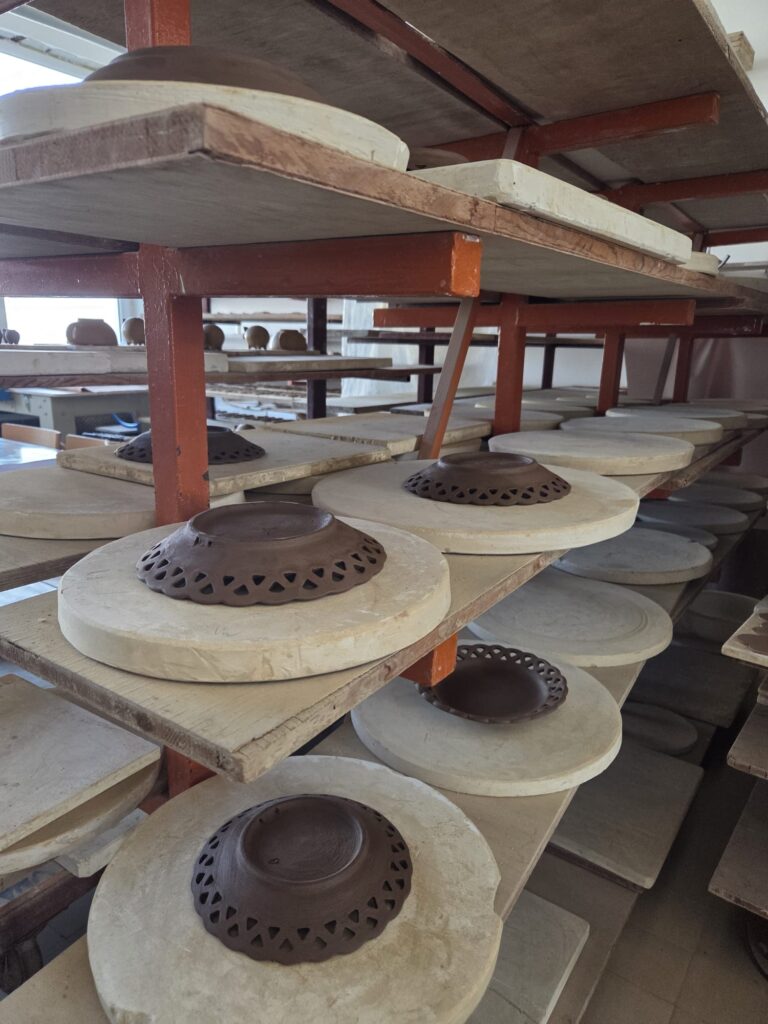 V pátek jsme retušovaly poslední nedokonalosti, poté obtáčely vytočené výrobky, glazovaly jsme přežahlé výrobky určené k malbě, abychom je měly připravené na další týden, kdy budeme provádět malbu tradičních vzorů do syrové glazury.